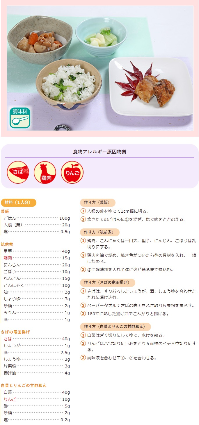 菜飯、筑前煮、さばの竜田揚げ、白菜とりんごの甘酢和え