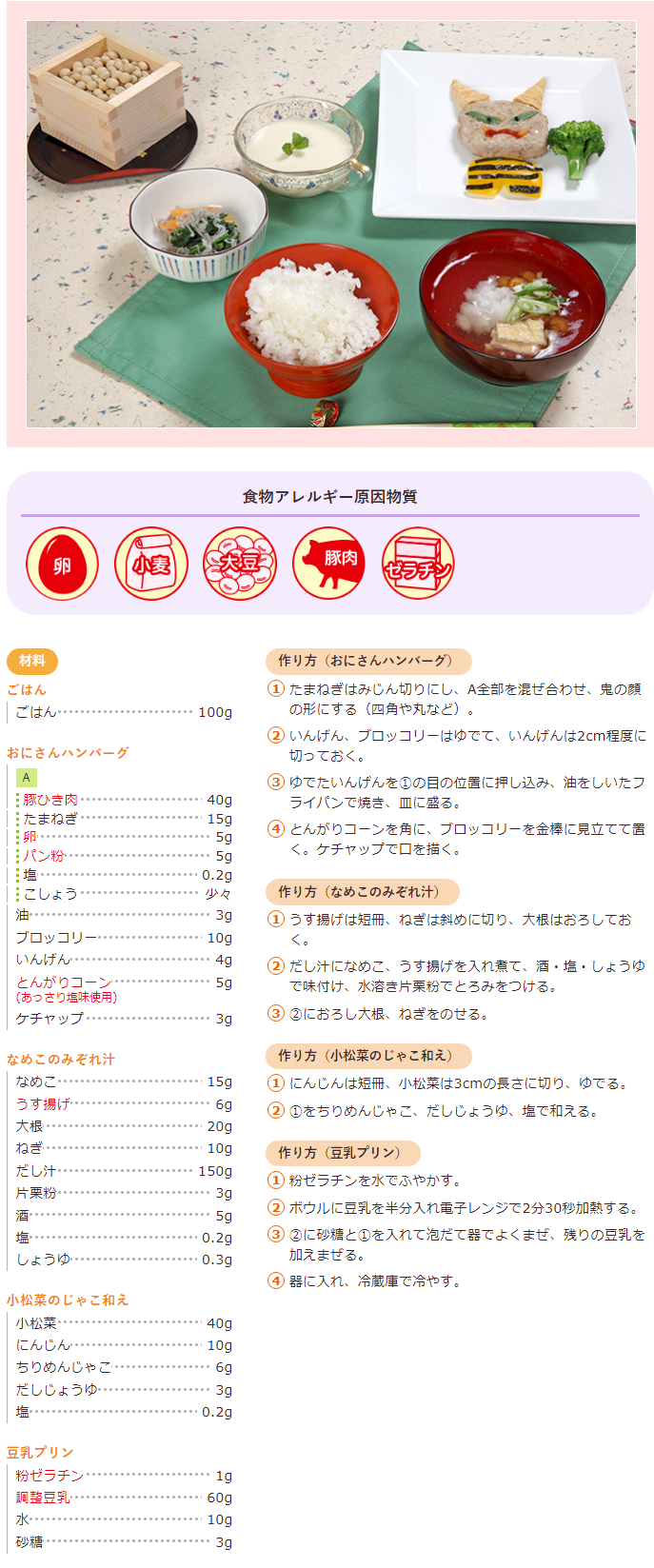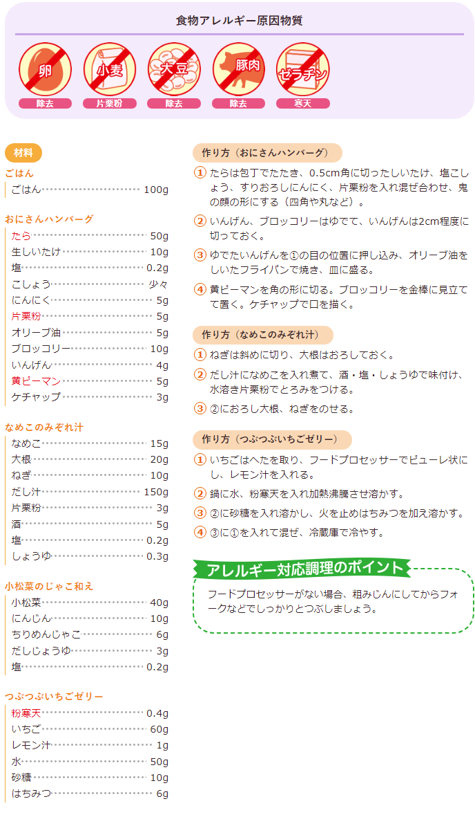 おにさんハンバーグ、なめこのみぞれ汁、小松菜のじゃこ和え、つぶつぶいちごゼリー | ふく育ポータルサイト